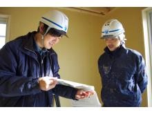 現場での作業指示をする技術者の社員と施工内容を確認する配管工の作業風景です。コミュニケーションを良くすることで作業もスムーズに行えるのでとても重要です。現場で施工指示をしている社員が技術者です。彼はこう見えて前職は美容師!未経験でも立派に仕事をこなしております。また指示を受けているのが配管工です。配管工の社員も前職はガスの配管工の仕事をしておりました。未経験者でも分かり易く丁寧に教えてくれる社員ばかりですので安心してください!